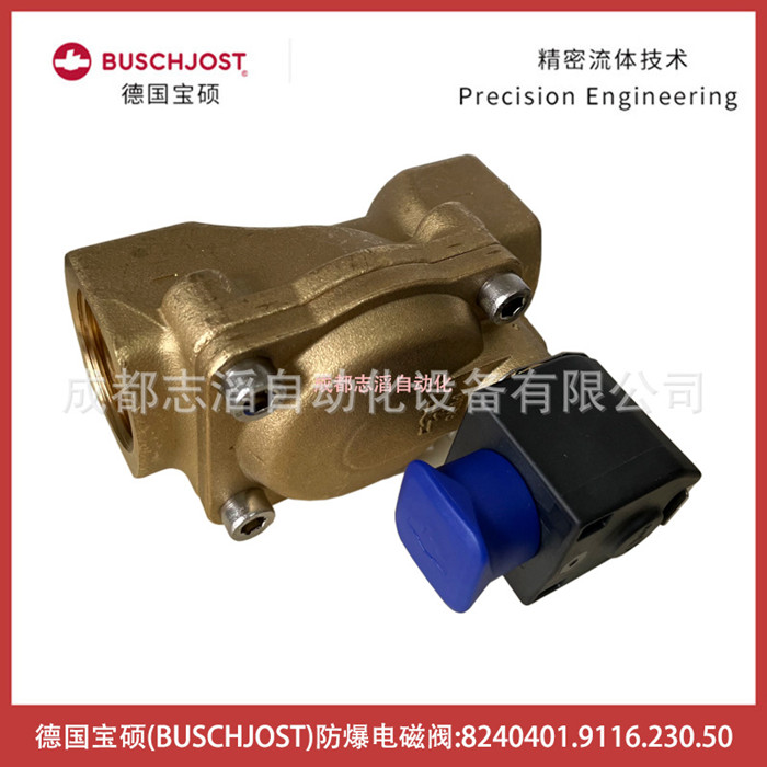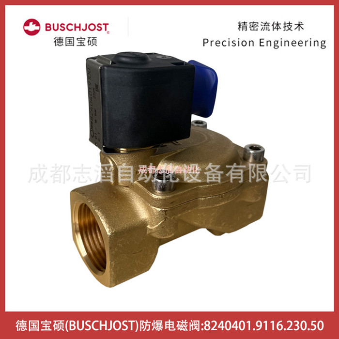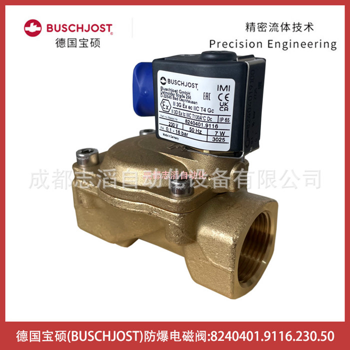 8240401.9116.230.50德国宝硕BUSCHJOST防爆电磁阀-气动控制元件技术参数简介:流通通径25mm、接口尺寸G1、工作压力0.1-16bar、KV值9.5立方米/h、阀体重量0.95kg、配宝硕防爆线圈9116、线圈电压为AC220V交流、电气连接为DIN43650!线圈功耗7瓦、线圈重量为0.15kg防护等级IP65、环境温度为-25到50摄氏度、产地为德国,应用在水处理设备!