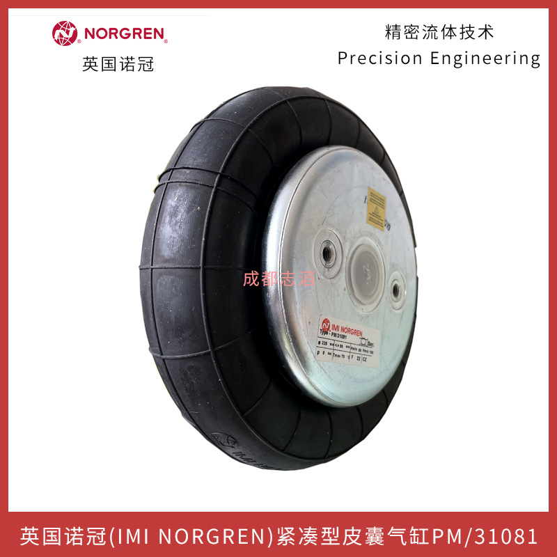 英国诺冠(IMI NORGREN)紧凑型皮囊气缸PM/31000技术优势:无摩擦运行、免维修、面润滑、适用于短行程、大负载工况高隔振性能、简易,紧凑安装!
