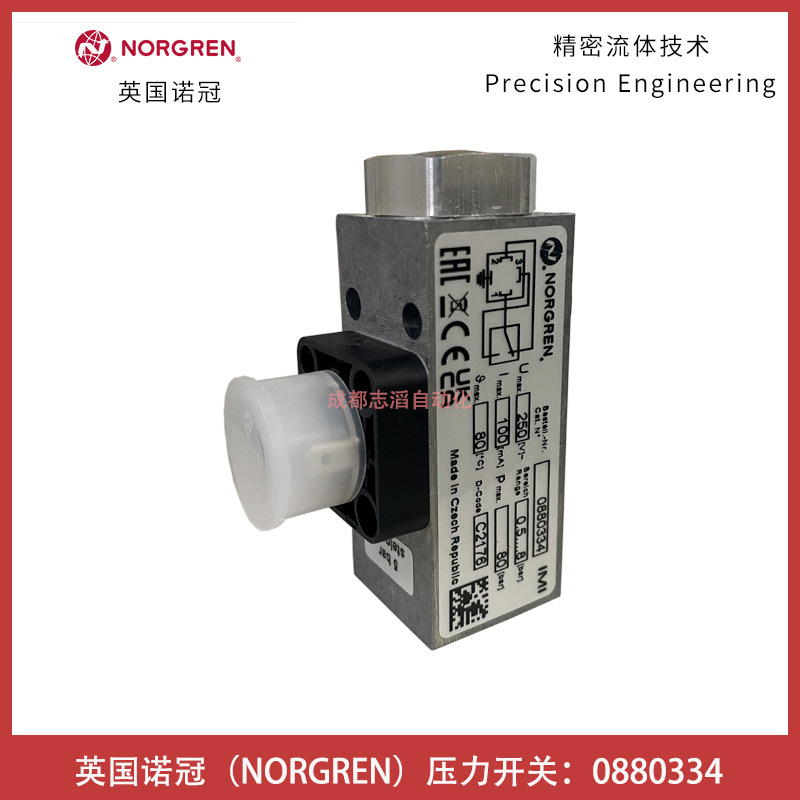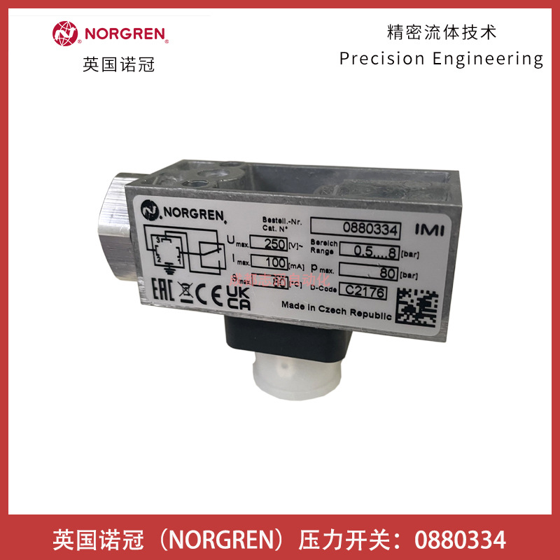 0880334英国诺冠(NORGREN)压力开关技术参数简介:zui大电流可达250V、压力范围0.5-8bar、zui大压力可达80bar、zui大电流可达100毫安、zui高温度可达80摄氏度、气口螺纹、切换时间1001/min、压力开关材料外壳铝/钢、密封件材料PTFE/NBR、接管尺寸G1/4、重量0.2千克、电气接口DIN-EN175301、