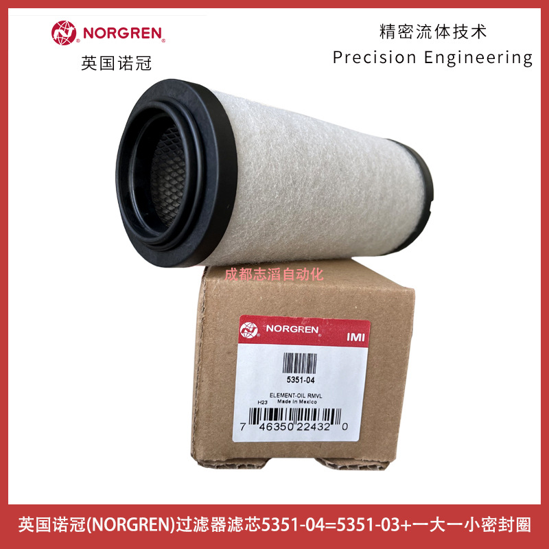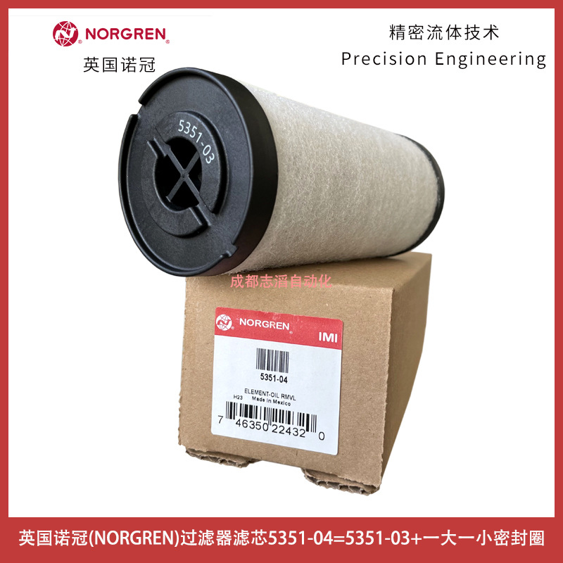 5351-04英国诺冠(IMI NORGREN)除油过滤器滤芯技术参数简介说明:5351-04=5351-03(过滤精度为5um)+2个黑色的一大一小O型圈组装;现在来货5351-03为白色(以前来货是绿色),5351-04为诺冠(norgren)除油过滤器F46-801-M0DG(主体颜色为黑色)和F46-831-M0DG(主体颜色为白色)的滤芯,主要应用在轨道交通-干燥塔过滤器和船舶发动机!5351-04的产地为墨西哥,5351-03的产地为英国!